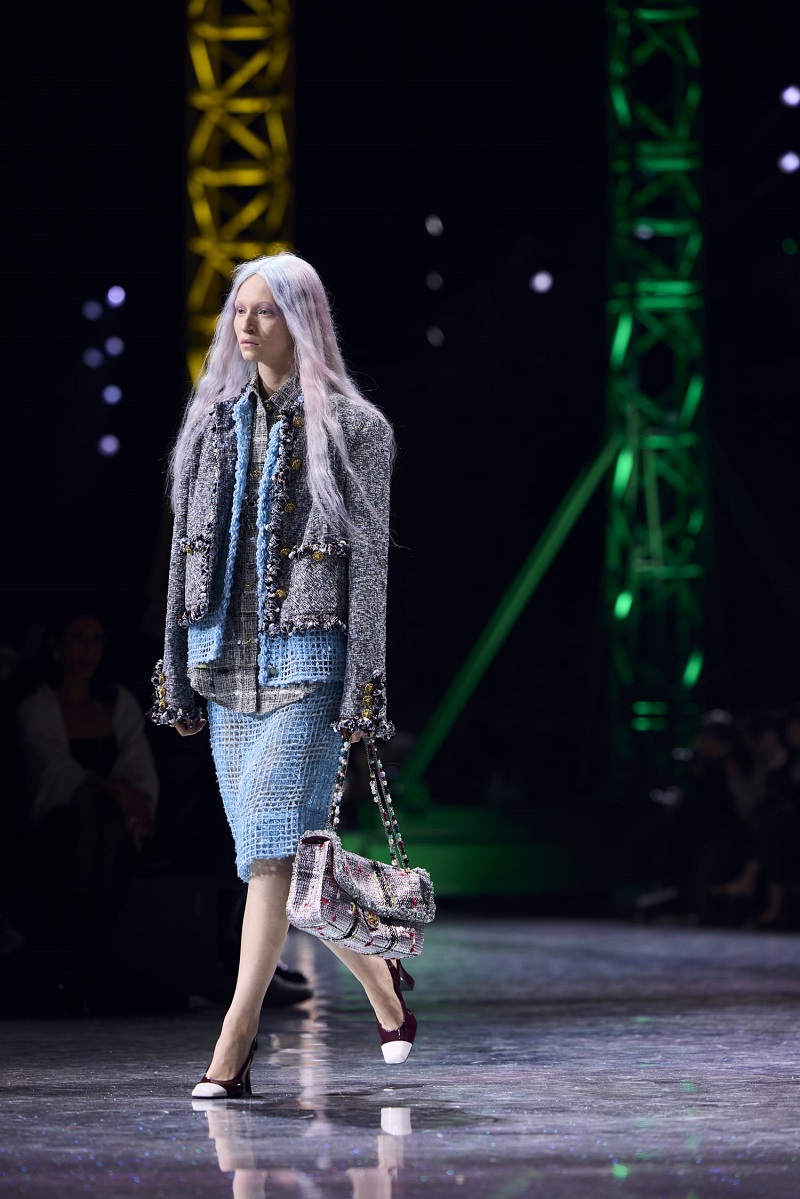 The collection moves through time, layering silhouettes: light layers, relaxed cuts, from the 1920s to the 1960s, and returning to the 1920s, where we find ourselves today. The Chanel suit, as the central archetype, is boldly reimagined: ribbed knits, classic tweeds, fabrics woven with artificial fibres, lurex and silicone, natural gauze, 1920s-style silk jerseys interwoven with tweed, and new techniques in embroidered and knit suits that demonstrate exceptional lightness and mobility.
