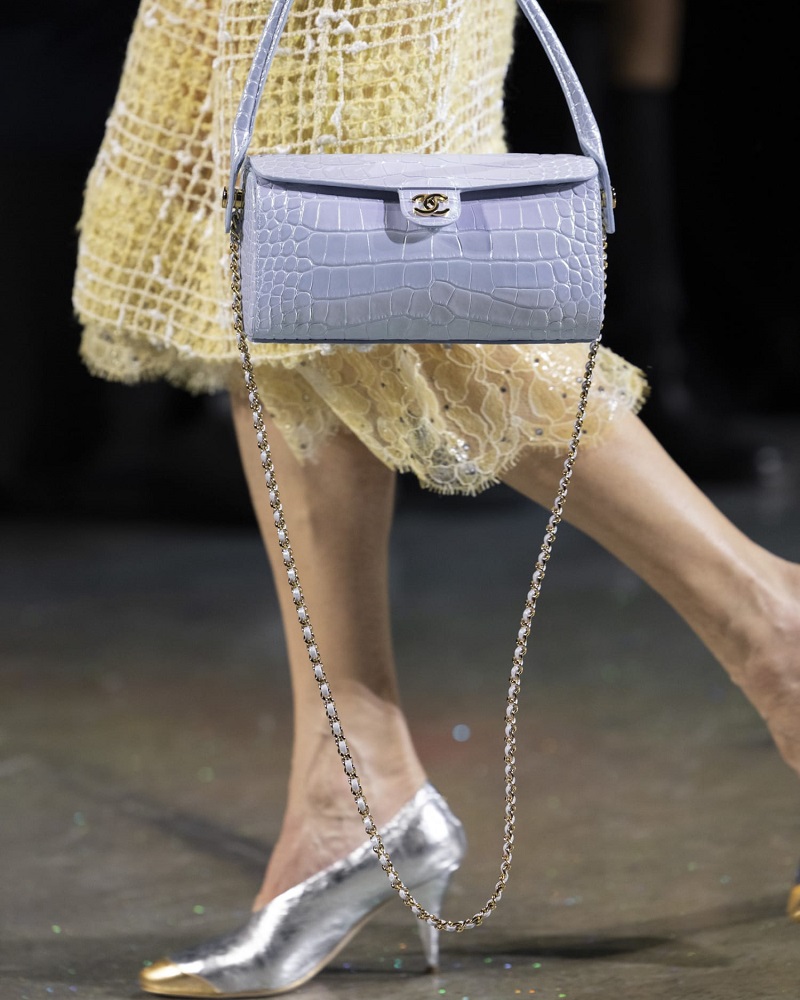 The dialogue between real and artificial is realized in the accessories: enamel and resin jewelry saturated with color, artificially dyed mother-of-pearl pieces, pastel second-skin boots, and a range of bags from practical to playful. From the iconic beige suede flap bag with its “divan matelassé” inspired by Gabrielle Chanel’s apartment couch, to the kinetic-lock bag and the extravagant pomegranate minaudière with iridescent enamel, each piece is a coveted object and an invitation to explore the maison’s future.