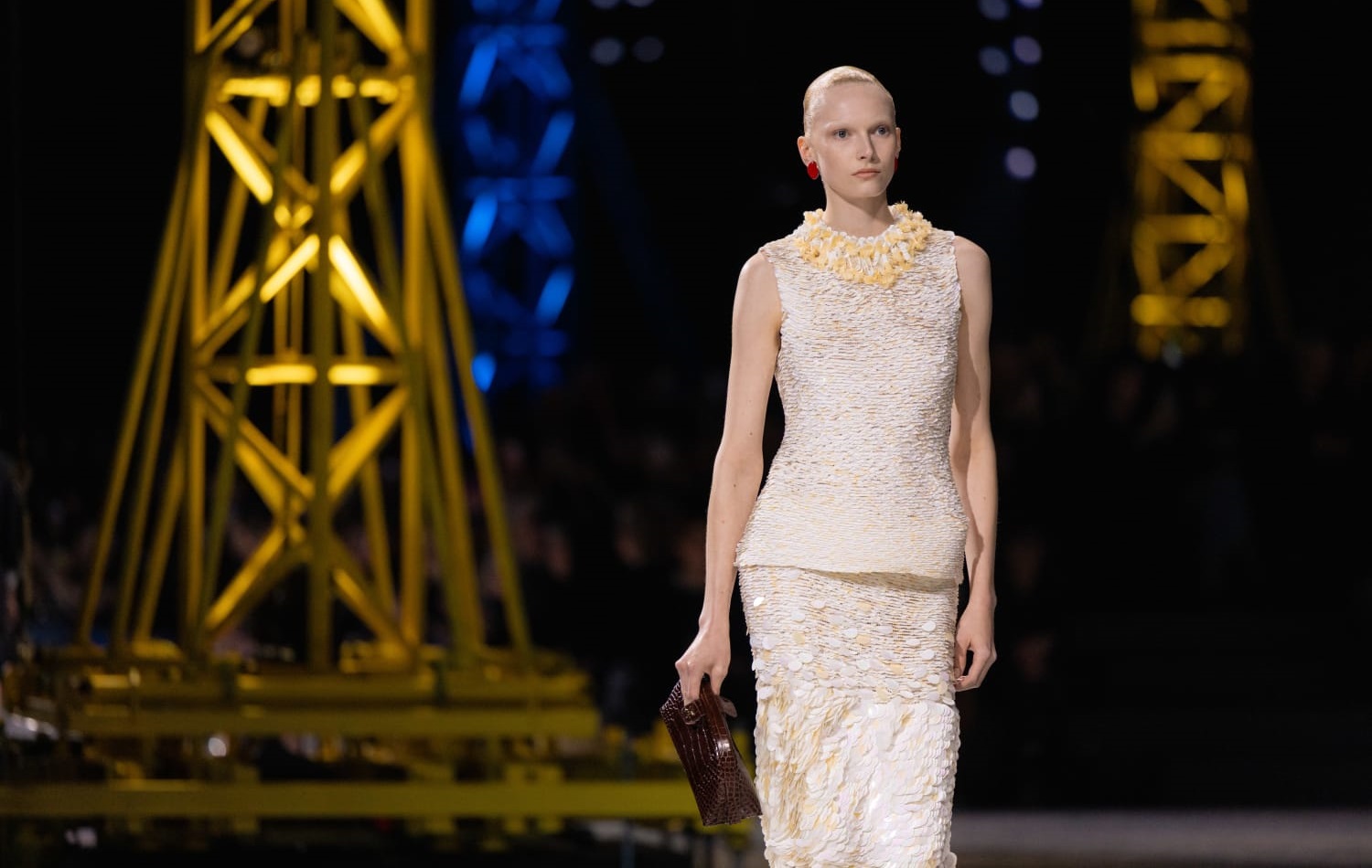 Once again, like a monastic ritual, devotees of CHANEL entered the grand temple of the Grand Palais. Upon entering, we were greeted by a striking set: colorful cranes rose between the seating, as if prepared for a ceremony. The iridescent floor hinted that that night we would witness something vibrant, new, almost magical. I wondered: why the cranes as part of the set design? Sometimes, the answers are simpler than they seem. The essence was clear: CHANEL is under construction. Its pillars and foundations remain solid, supporting a maison in transformation—a metamorphosis evident since Matthieu Blazy’s first collection, with packed stores and viral accessories on TikTok.